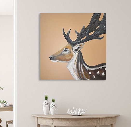 Jedes Tier ist einzigartig und wunderschön. Rothirsche sind unsere größten freilebenden Wildtier und sehr imposant. Der kleinere Dammhirsch steht diesem aber nicht nach und wie jedes Tier, ob groß oder klein, hat es seinen ganz eigenen Ausdruck und Reiz. Diese Bild hat einen cremefarbenden Hintergrund mit einem leichten Goldschimmer. Diese Kombination gibt dem Bild eine elegante und warme Note. Die Reduktion des Hintergrund hebt das Motiv eindrucksvoll hervor. Der Hirsch ist dabei mit leichten abstrakten Elementen dargestellt und kombiniert so eine moderne und traditionelle Darstellung.