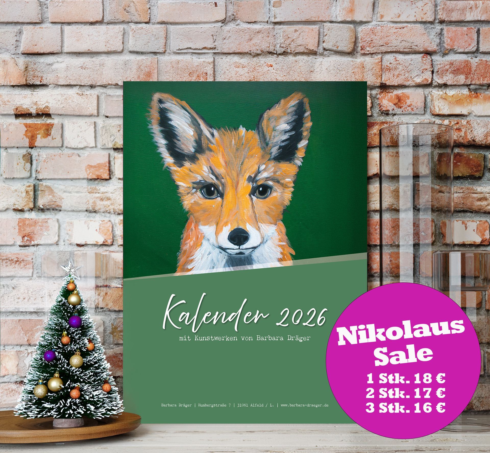 Jeder Monat zeigt ein handgemaltes Wildtier – vom neugierigen Fuchs bis zum stillen Hirsch.