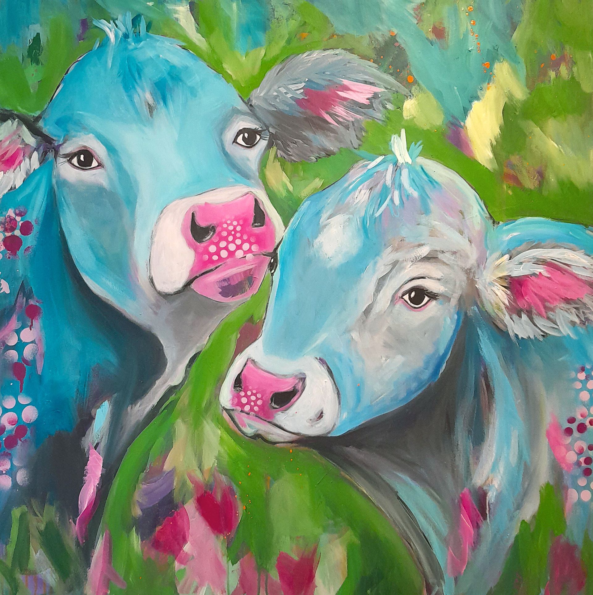 "Foxlove" - Der Hintergund ist mit sanften Übergängen in den Farben grün und pink gestaltet Ergänzung zu dem in schnellen Pinselstrichen gestalteten Fuchs. Das Fell des Fuchs ist dynamisch. In der Anmutung als ob es sich in Bewegung befindet. Dabei löst sich das Fell des Fuchses in abstrakten Anklängen auf und gibt dem Bild einen modernen Stil.