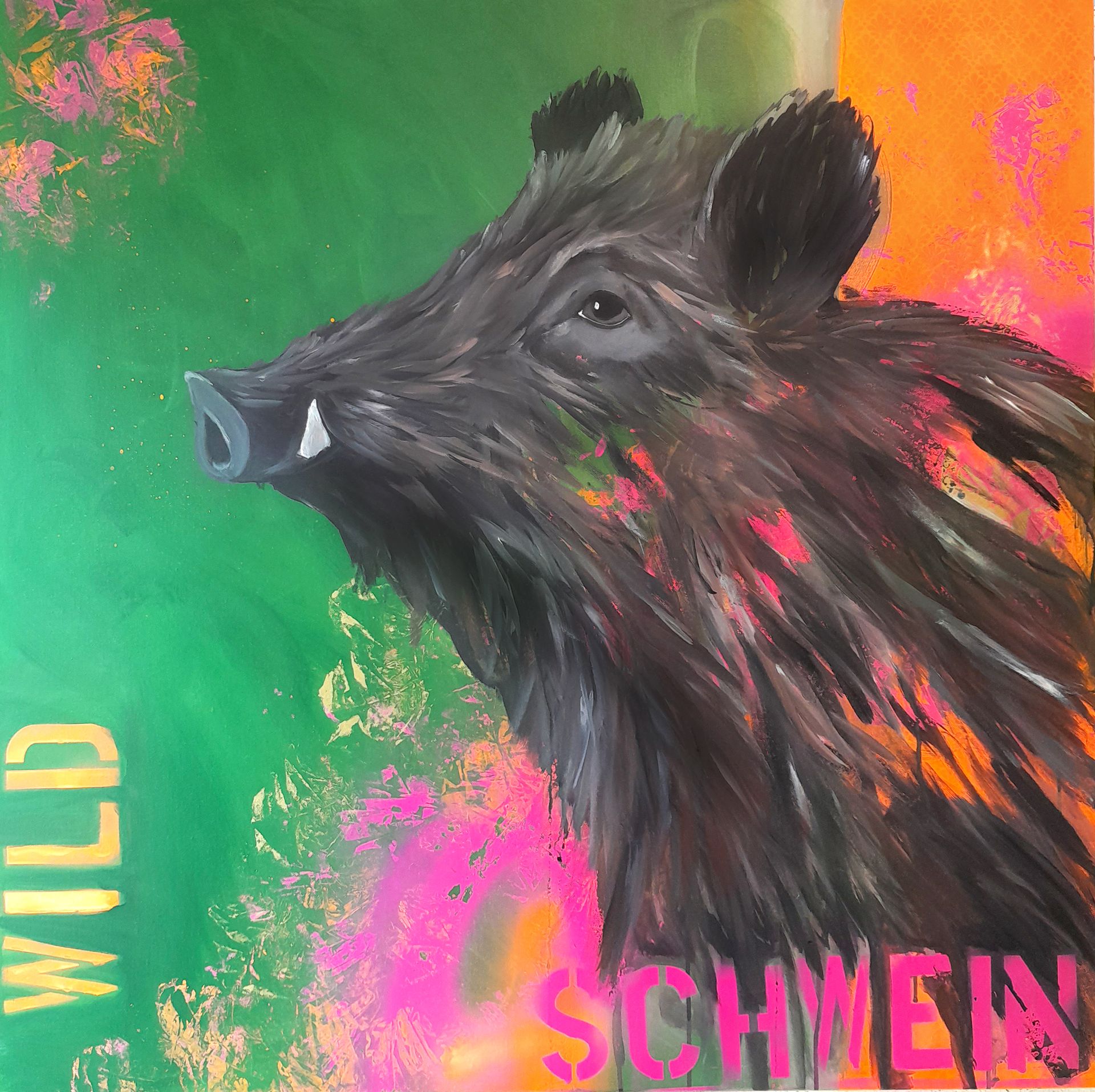 Diese Wildschwein, ein schlauer Keiler, ist ein Prachtstück und symbolisiert, wie schlau und stark unsere wilden Schweine sind. Der HIntergrund ist modern, abstrakt und etwas StreetArt. Die Sau natürlich in ihren natürlichen Farben schwarz, braun, grau. Das Tier ist hierbei figurativ, abstrakt angelegt. Der Hintergrund zeigt sich durch das borstige Fell des Tieres.